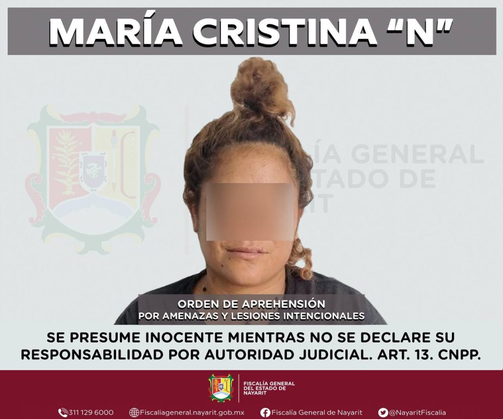 La Fiscalía General del estado de Nayarit informa que elementos de la Agencia de Investigación Criminal ejecutaron una orden de aprehensión en la ciudad de Tepic contra María Cristina “N”, por su probable participación en hechos que la ley tipifica como delitos de amenazas y lesiones intencionales, cometidos contra una persona de sexo femenino de quien se reserva la identidad respetando su derecho a la privacidad e integridad.
