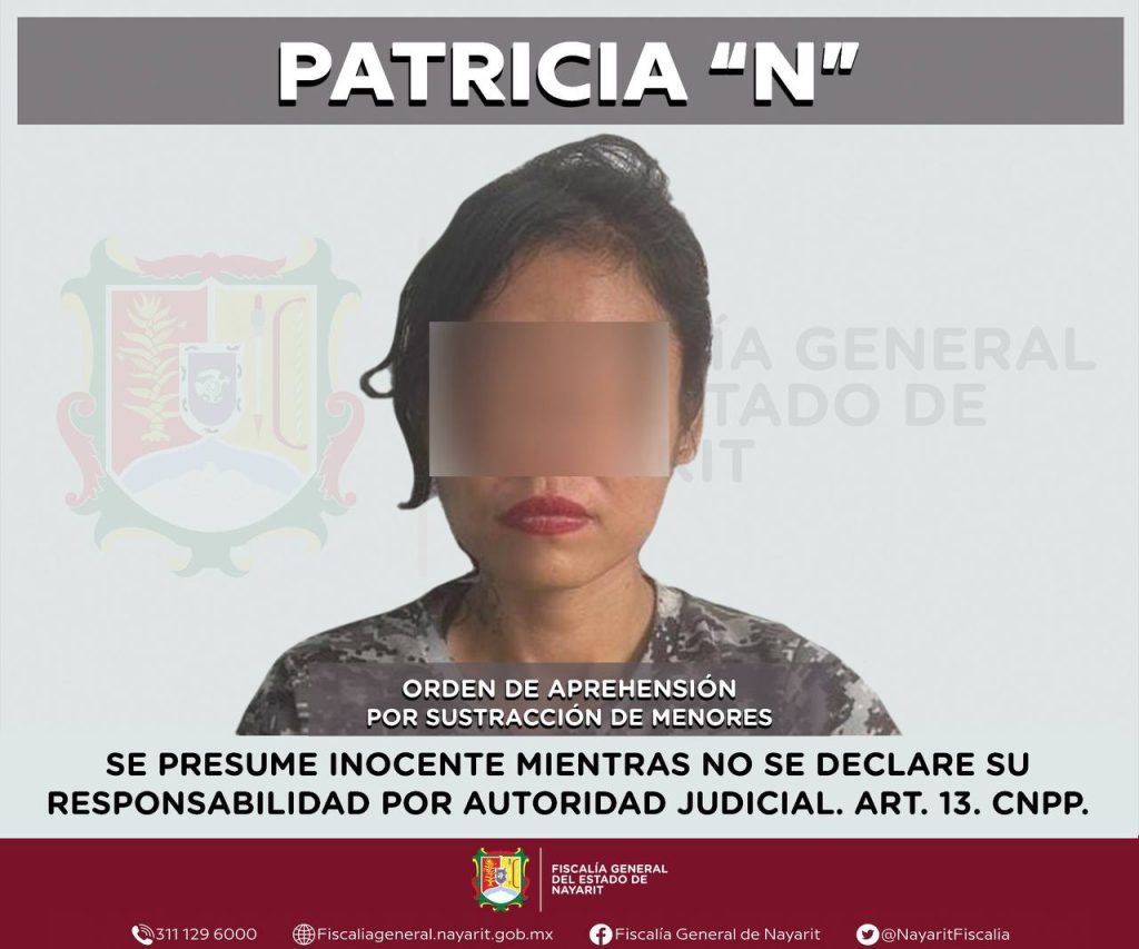 La Fiscalía General del estado de Nayarit informa que elementos de la Agencia de Investigación Criminal ejecutaron una orden de aprehensión en la ciudad de Tepic contra Patricia “N”, por su probable participación en hechos que la ley tipifica como delito de sustracción de menores, cometido contra una niña de quien por respeto a su derecho a la privacidad e integridad se reserva la identidad.