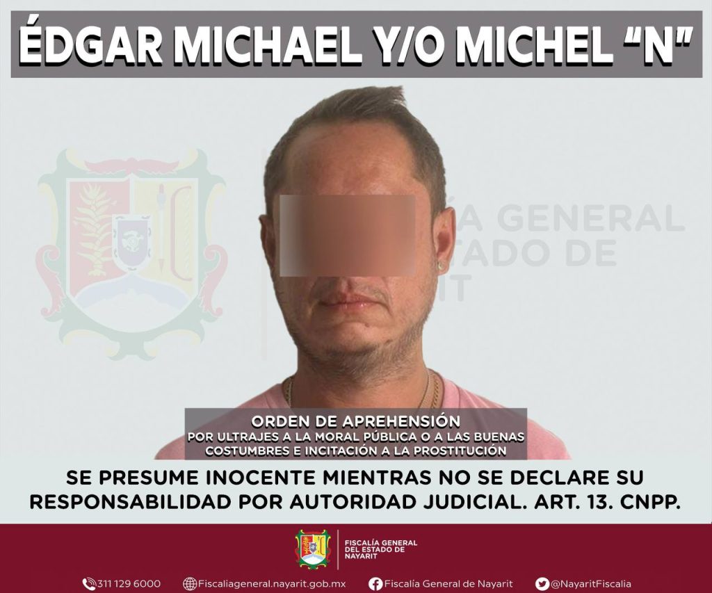 Elementos de la Agencia de Investigación Criminal de Nayarit ejecutaron una orden de aprehensión en la ciudad de Tepic contra Édgar Michael y/o Michel “N”, por su presunta participación en hechos que según apreciación de la ley configuran los delitos de ultrajes a la moral pública o a las buenas costumbres e incitación a la prostitución, cometidos contra una persona de sexo masculino de quien se reserva la identidad respetando su derecho a la privacidad e integridad.