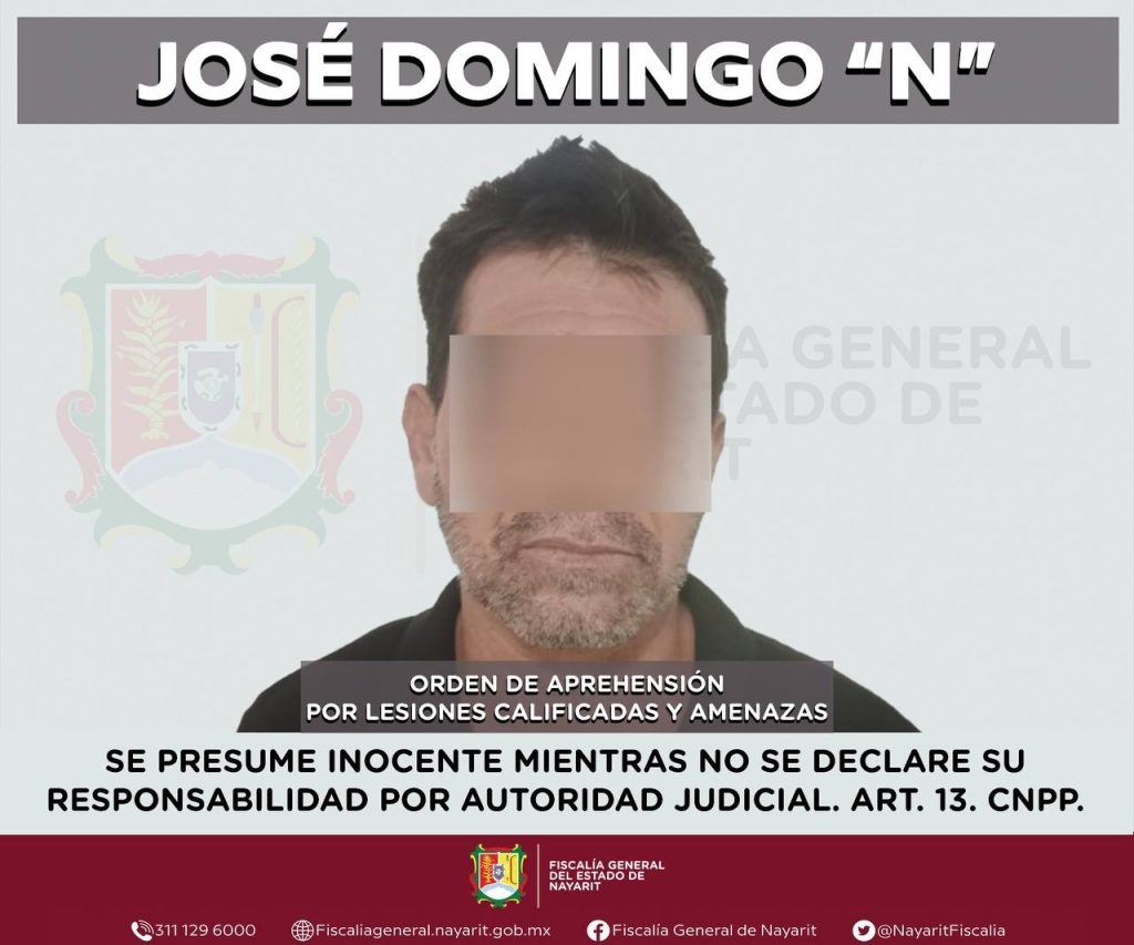 La Fiscalía General del estado de Nayarit informa que elementos de la Agencia de Investigación Criminal ejecutaron una orden de aprehensión en el municipio de Acaponeta contra José Domingo “N”, por su probable participación en hechos que la ley tipifica como delitos de lesiones calificadas y amenazas, cometidos en agravio de una persona de sexo masculino cuya identidad se mantiene bajo reserva por respeto a su derecho a la privacidad e integridad.