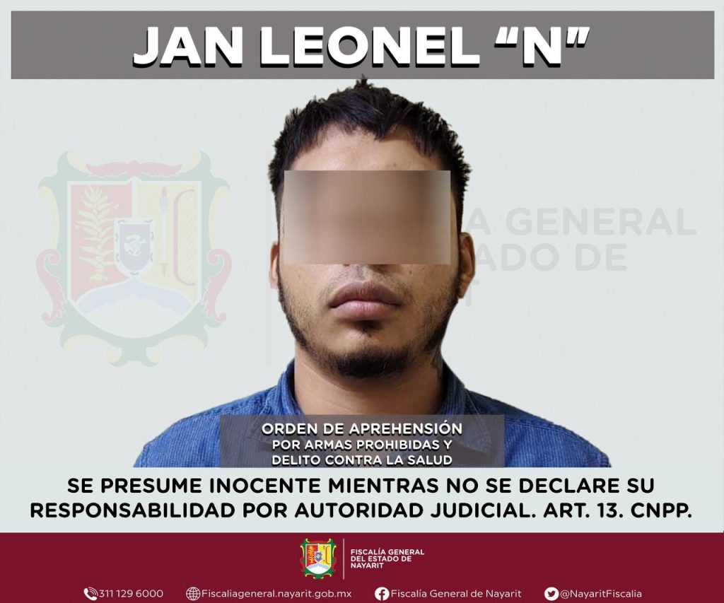 La Fiscalía General del estado de Nayarit informa que elementos de la Agencia de Investigación Criminal ejecutaron dos órdenes de aprehensión en la ciudad de Tepic contra Jan Leonel “N”, la primera por su probable participación en hechos que la legislación vigente tipifica como delito de armas prohibidas, en tanto la segunda es por ser presunto responsable de delito contra la salud en su modalidad de narcomenudeo -en su hipótesis de posesión de psicotrópicos-. Ambos delitos son en agravio de la sociedad.