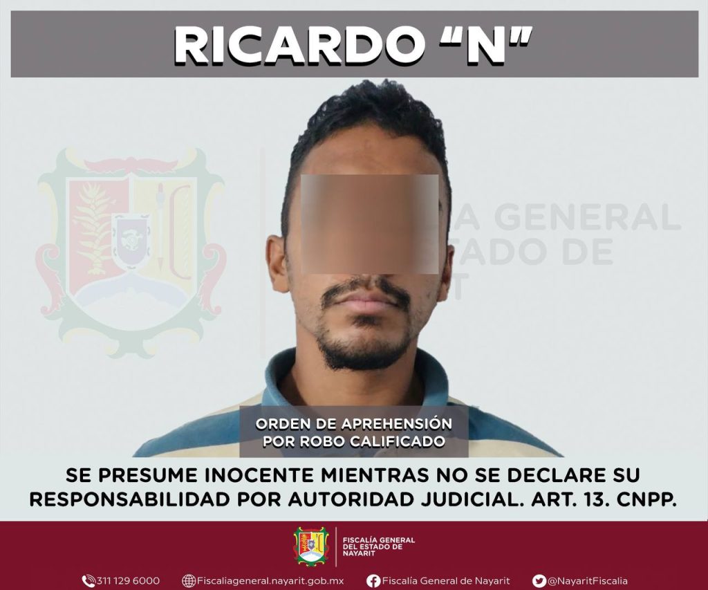 La Fiscalía General del estado de Nayarit informa que elementos de la Agencia de Investigación Criminal ejecutaron una orden de aprehensión en la ciudad de Tepic contra Ricardo “N”, por su probable participación en hechos que la legislación vigente tipifica como delito de robo calificado, cometido en perjuicio de la cadena comercial Oxxo, S. A. de C. V.