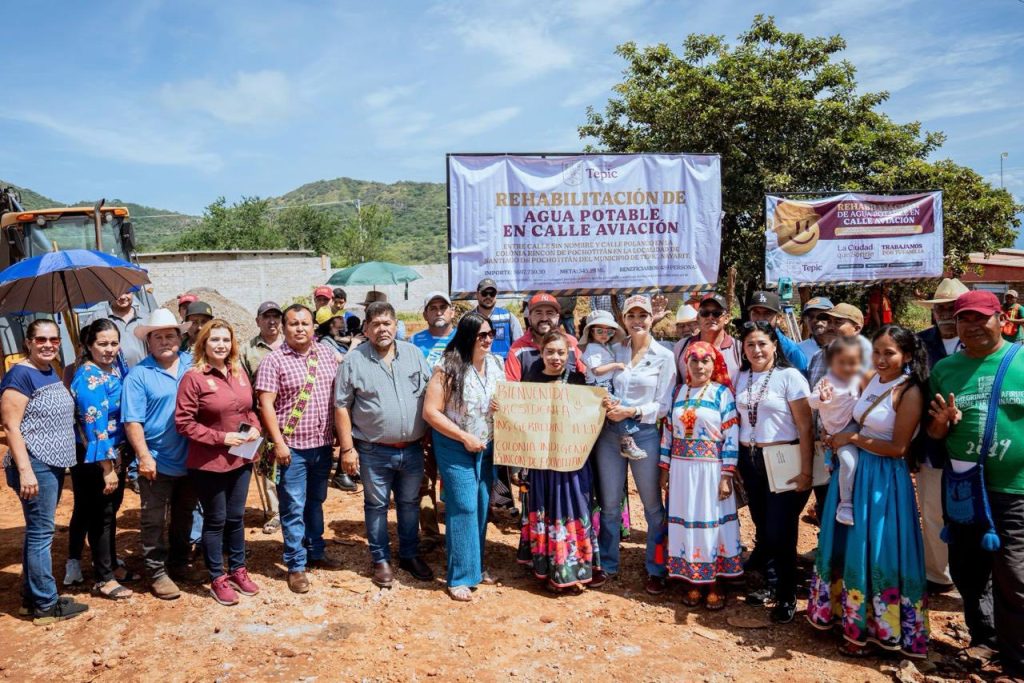 La presidenta municipal de Tepic, Ing. Geraldine Ponce, dio el banderazo de inicio a la rehabilitación de la red de agua potable en la calle Aviación, en la localidad de Santiago de Pochotitán, donde además se realizarán trabajos de empedrado, lechereado y construcción de banquetas nuevas.