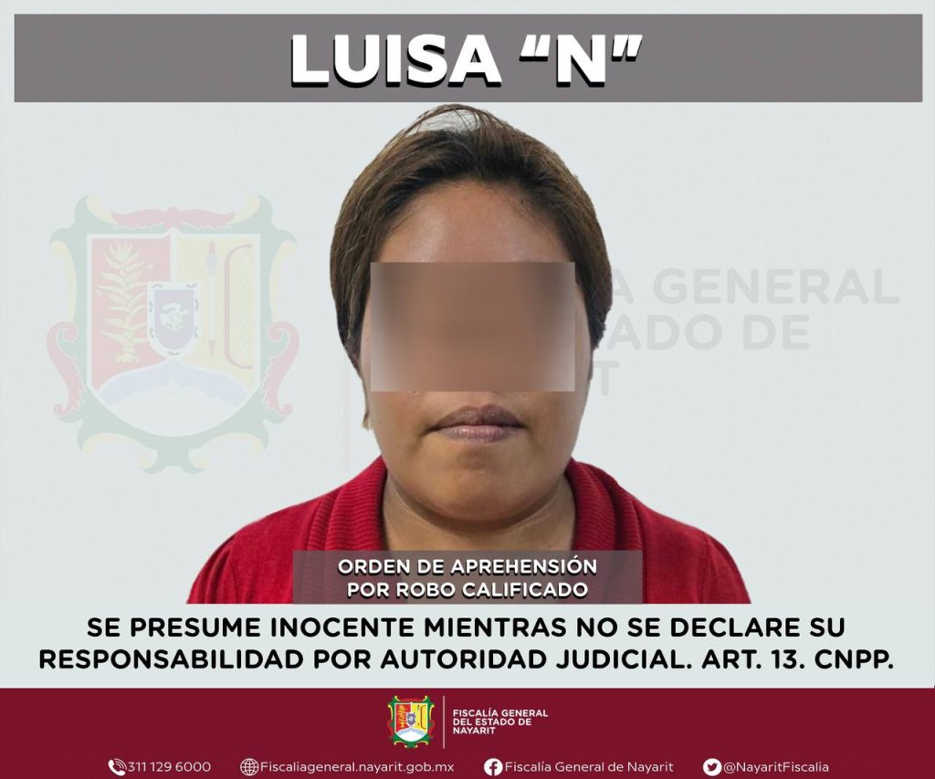 La Fiscalía General del estado de Nayarit informa que elementos de la Agencia de Investigación Criminal ejecutaron una orden de aprehensión en la ciudad de Tepic contra Luisa “N”, la primera por su probable participación en hechos que la legislación vigente tipifica como delito de robo calificado.