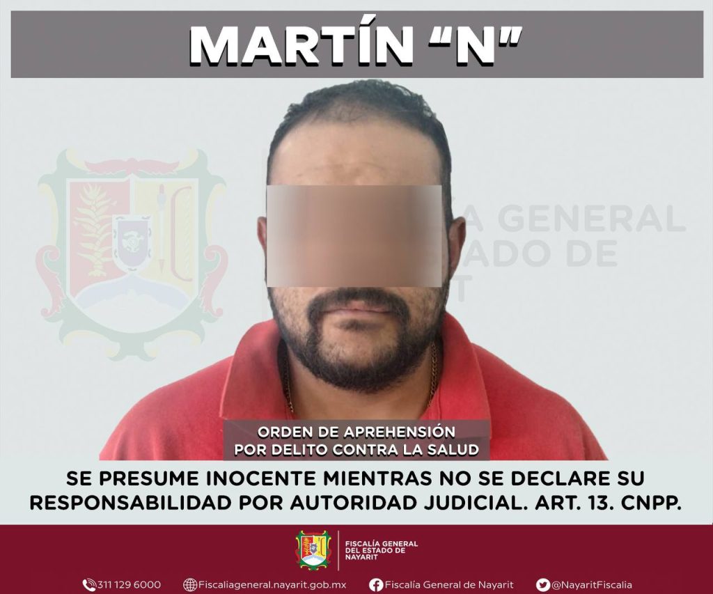 La Fiscalía General del estado de Nayarit informa que elementos de la Agencia de Investigación Criminal ejecutaron una orden de aprehensión en la capital nayarita contra Martín “N”, por su probable participación en hechos que la ley tipifica como delito contra la salud en su modalidad de narcomenudeo -en su hipótesis de posesión de psicotrópicos-, cometido en agravio de la sociedad.