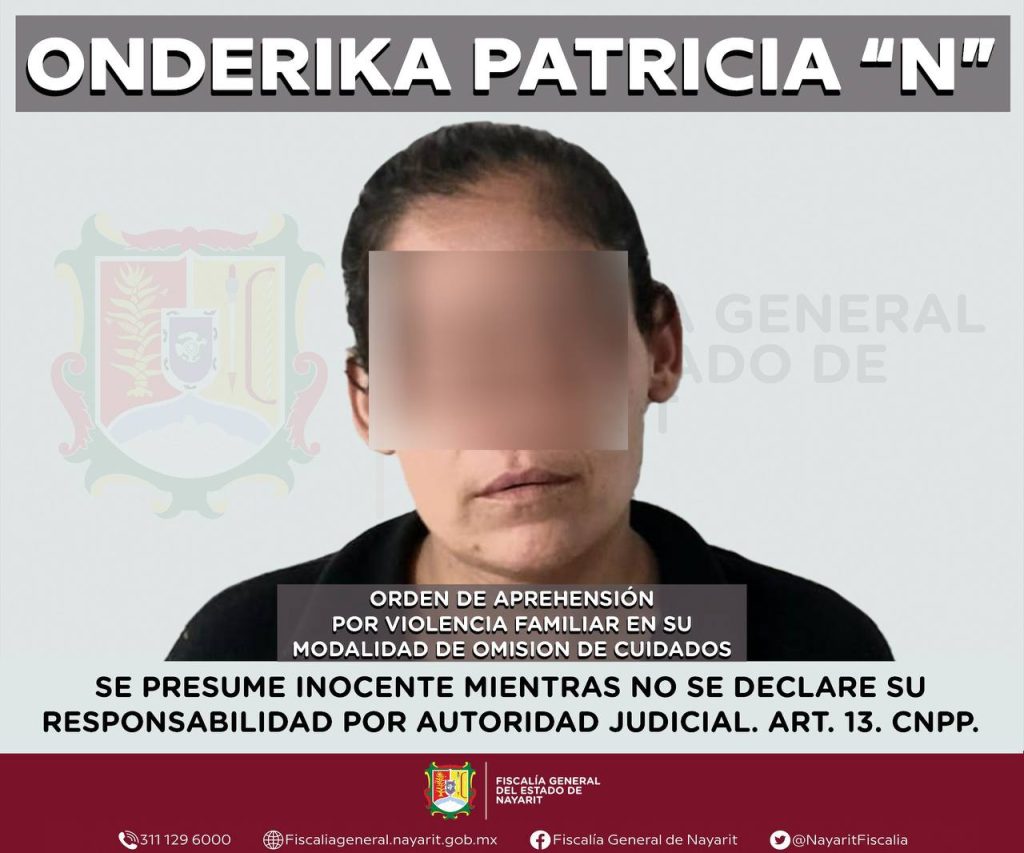 La Fiscalía General del estado de Nayarit informa que elementos de la Agencia de Investigación Criminal ejecutaron una orden de aprehensión en la ciudad de Tepic contra Onderika Patricia “N”, por su probable participación en hechos que para la ley configuran el delito de violencia familiar -en su modalidad de omisión de cuidados-, cometido en agravio de dos niñas y un niño cuyas identidades se reservan por respeto a su derecho a la privacidad e integridad.