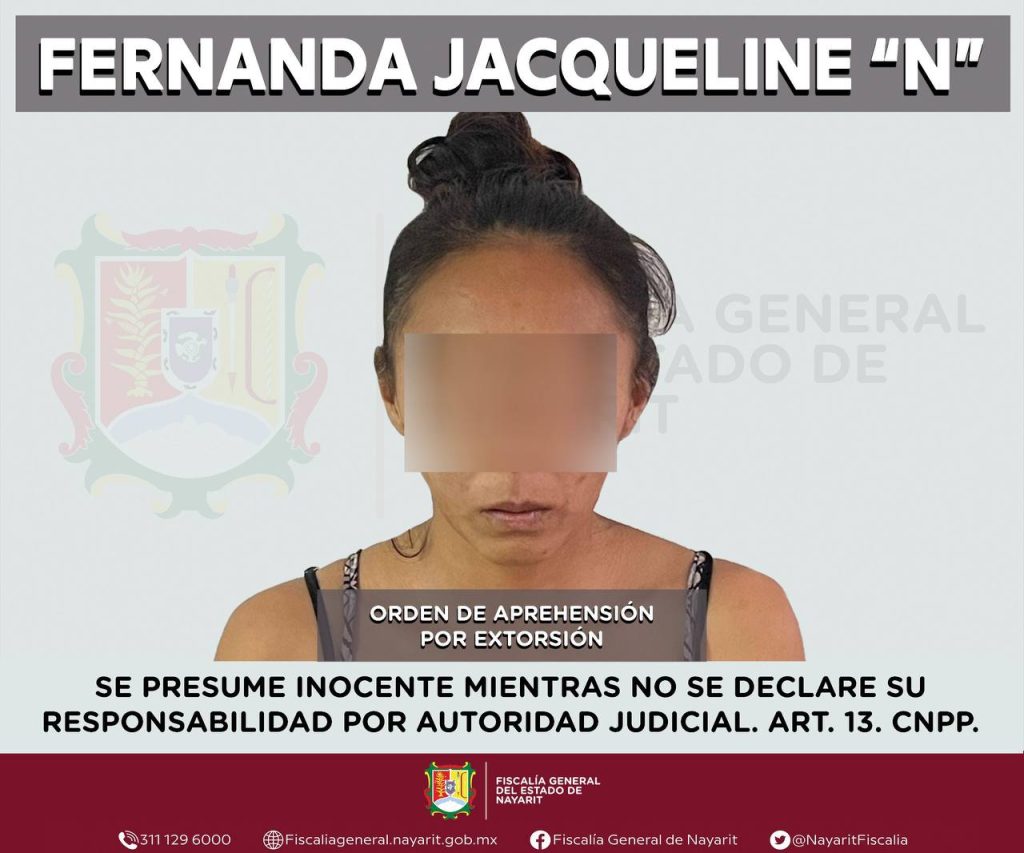 Elementos de la Agencia de Investigación Criminal de Nayarit cumplimentaron una orden de aprehensión en la ciudad de Tepic contra Fernanda Jacqueline “N”, por su probable participación en hechos que la legislación vigente tipifica como delito de extorsión, cometido en agravio de una persona de sexo femenino cuya identidad se reserva por respeto a su derecho a la privacidad e integridad.