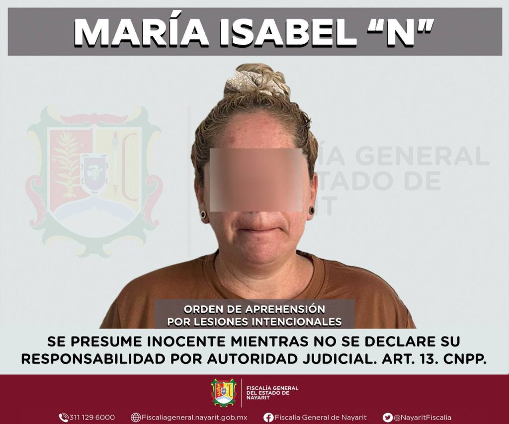 Elementos de la Agencia de Investigación Criminal de Nayarit ejecutaron una orden de aprehensión en la capital nayarita contra María Isabel “N”, por su probable participación en hechos que la legislación vigente tipifica como delito de lesiones intencionales, cometido en agravio de una persona de sexo femenino de quien se reserva la identidad por respeto a su derecho a la privacidad e integridad.