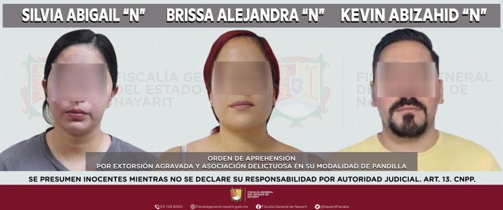 La Fiscalía General del estado de Nayarit informa que elementos de la Agencia de Investigación Criminal ejecutaron una orden de aprehensión en la ciudad de Tepic contra Brissa Alejandra “N”, Silvia Abigail “N” y Kevin Abizahid “N”, por su probable participación en hechos que la ley tipifica como delitos de extorsión agravada y asociación delictuosa -en su modalidad de pandilla-, cometidos en agravio de una persona de sexo masculino cuya identidad se reserva por respeto a su derecho a la privacidad e integridad.