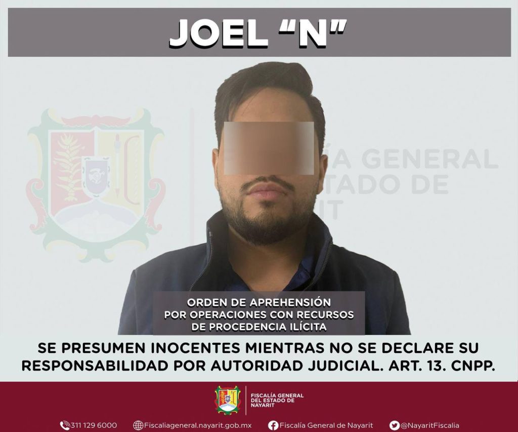 La Fiscalía General del estado de Nayarit informa que en coordinación con la Fiscalía General de Jalisco, fue cumplimentada una orden de aprehensión en la ciudad de Guadalajara contra Joel “N”, por su probable responsabilidad en el delito de operaciones con recursos de procedencia ilícita, en agravio de la sociedad.