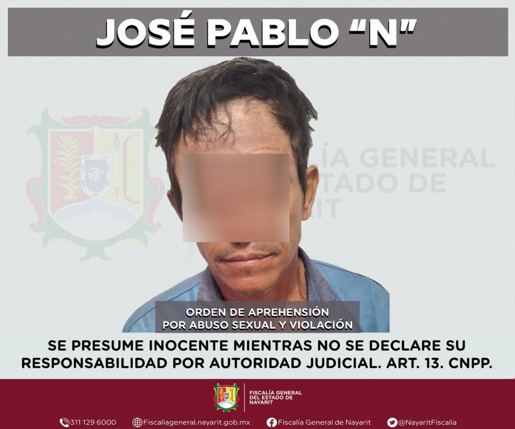 La Fiscalía General del estado de Nayarit informa que elementos de la Agencia de Investigación Criminal ejecutaron una orden de aprehensión en el municipio de Tecuala contra José Pablo “N”, por su probable participación en hechos que la ley tipifica como delitos de abuso sexual y violación, cometidos en agravio de una menor de edad cuya identidad se reserva en atención a su derecho a la privacidad e integridad.