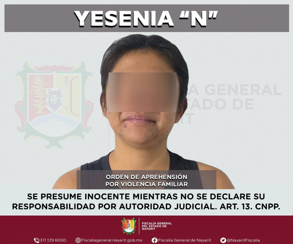 Elementos de la Agencia de Investigación Criminal de Nayarit ejecutaron una orden de aprehensión en la ciudad de Tepic contra Yesenia “N”, por su probable participación en hechos que la legislación vigente tipifica como delito de violencia familiar, cometido en agravio de una persona cuya identidad se reserva en atención a su derecho a la privacidad e integridad.
