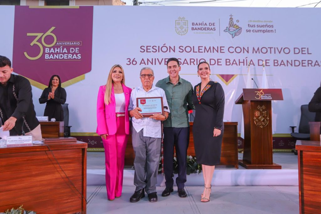 Asimismo, se rindió homenaje al exgobernador Celso Humberto Delgado Ramírez por su papel decisivo en la conformación del municipio. El presidente Santana García señaló que “su determinación histórica permitió que Bahía de Banderas surgiera como un proyecto de prosperidad para las futuras generaciones”. En representación del gobernador Miguel Ángel Navarro Quintero, la secretaria general de Gobierno, doctora Rocío Esther González, recibió el reconocimiento otorgado al Gobernador del estado por su respaldo a las obras y políticas públicas que fortalecen el bienestar social.