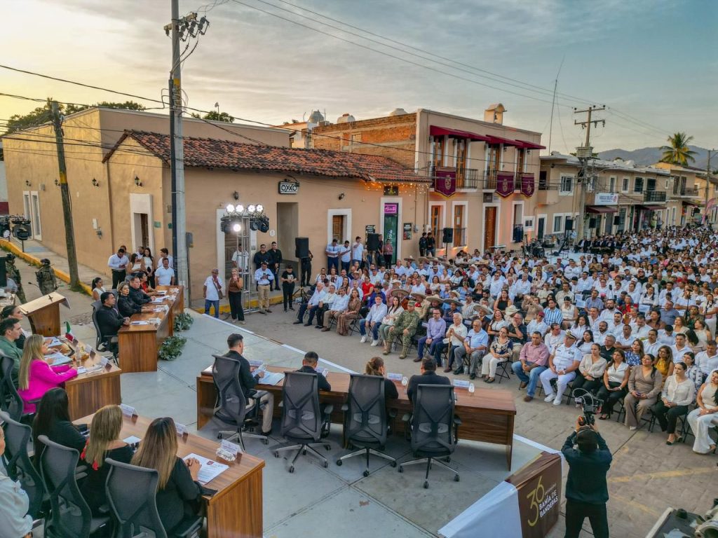 En un acto de profundo significado histórico, el XII Ayuntamiento de Bahía de Banderas, encabezado por el presidente municipal Héctor Javier Santana García, celebró este 11 de diciembre la Sesión Solemne con motivo del 36 aniversario de la creación del municipio. La Plaza Pública de Valle de Banderas fue el escenario de esta ceremonia que congregó a autoridades de los tres órdenes de gobierno, así como exmandatarios municipales, fuerzas armadas, sectores productivos y a la ciudadanía.