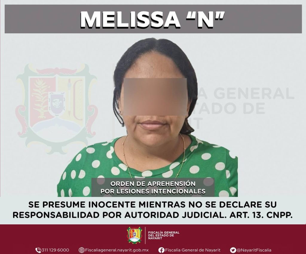 Elementos de la Agencia de Investigación Criminal de Nayarit ejecutaron una orden de aprehensión en el municipio de Tecuala contra Melissa “N”, por su probable participación en hechos que para la ley configuran el delito de lesiones intencionales, cometido en contra de una persona de sexo femenino de la cual se reserva la identidad para salvaguardar su privacidad e integridad.