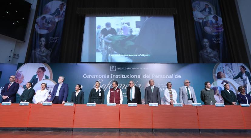 El director general del Instituto Mexicano del Seguro Social (IMSS), Zoé Robledo, y el secretario de Salud, doctor David Kershenobich Stalnikowitz, encabezaron la Ceremonia Institucional del Personal de Enfermería, en la que se reconoció a este gremio por la calidad en la atención y trato digno que brindan a la derechohabiencia, impulso de la prevención, detección oportuna de enfermedades, educación para la salud, vacunación, entre otras acciones.
