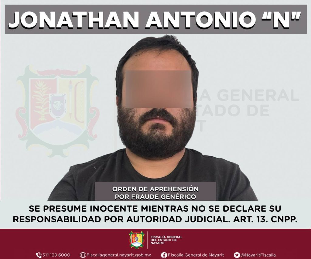 Elementos de la Agencia de Investigación Criminal de Nayarit ejecutaron tres órdenes de aprehensión en la ciudad de Tepic contra Jonathan Antonio “N”. Dos de los mandamientos judiciales corresponden a su probable participación en hechos que la ley tipifica como fraude genérico, mientras que el tercero deriva de su presunta responsabilidad en hechos constitutivos del delito de fraude. Las identidades de las víctimas se mantienen reservadas a fin de proteger su privacidad.