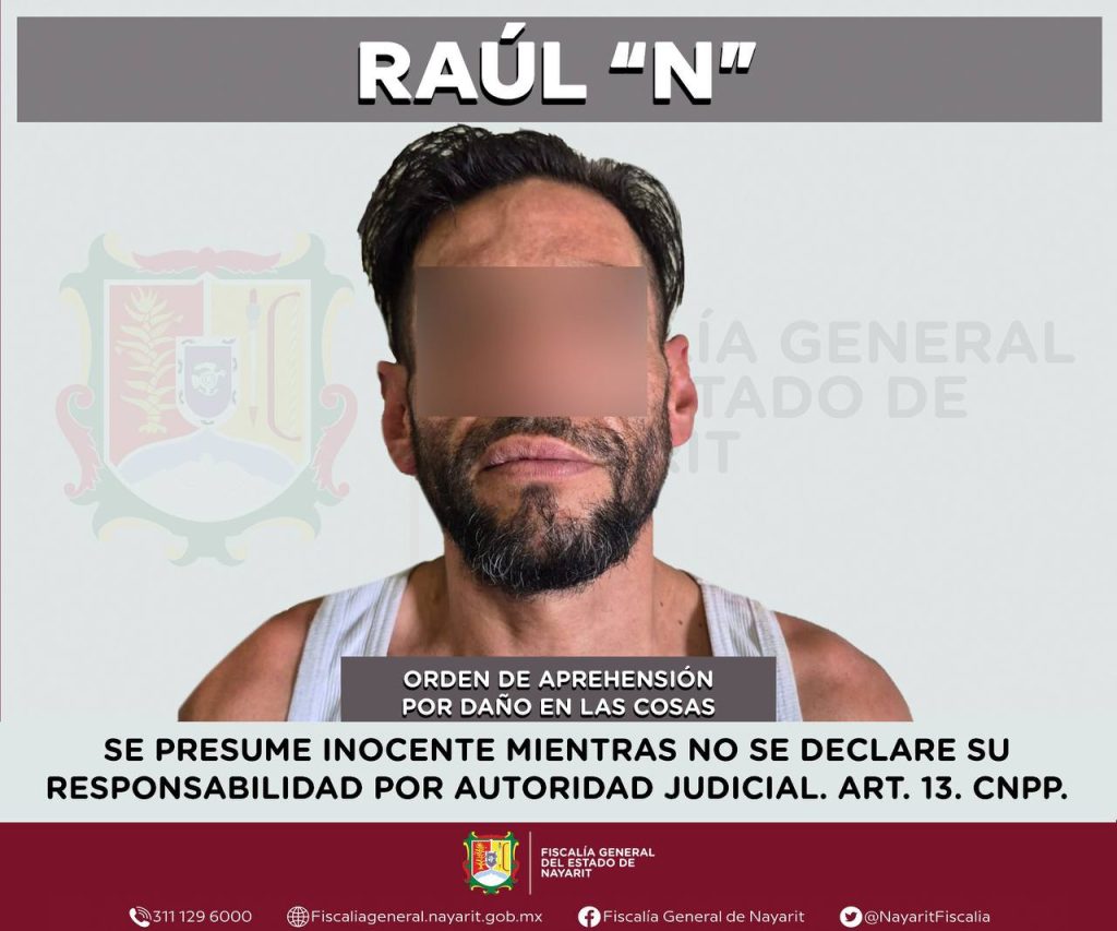 La Fiscalía General de Nayarit a través de la Agencia de Investigación Criminal ejecutó una orden de aprehensión en la ciudad de Tepic contra Raúl “N”, por su probable participación en hechos que para la ley configuran el delito de daño en las cosas, en perjuicio de una persona de sexo femenino de la cual se reserva la identidad para salvaguardar su privacidad e integridad.