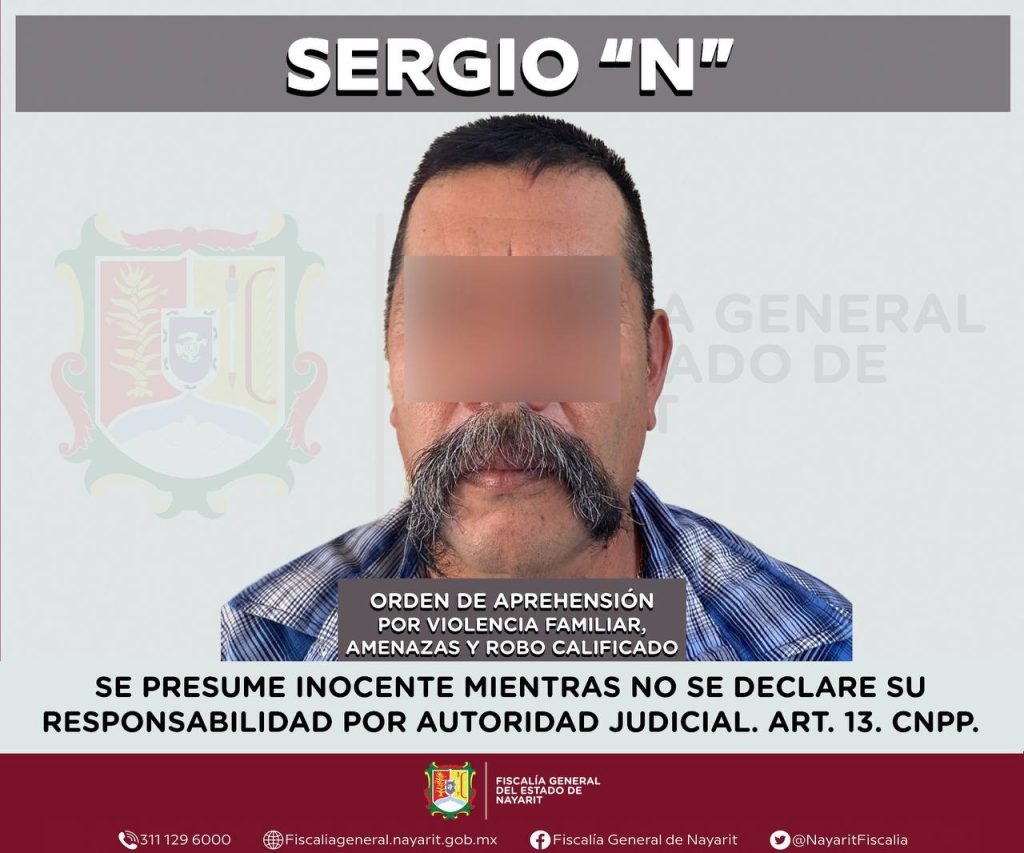 Elementos de la Agencia de Investigación Criminal de Nayarit ejecutaron una orden de aprehensión en la localidad Bellavista, municipio de Tepic contra Sergio “N”, por su probable participación en hechos que para la ley configuran los delitos de violencia familiar, amenazas y robo calificado, cometidos en agravio de dos personas de sexo femenino cuyas identidades se reservan para salvaguardar su privacidad.