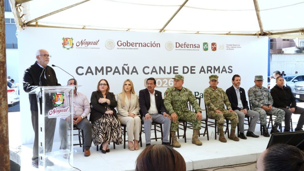 El gobernador del estado, Miguel Ángel Navarro Quintero, dio arranque a la campaña “Canje de Armas 2026: Sí al Desarme, Sí a la Paz”, en la explanada del Exconvento de la Cruz, en Tepic, como parte de una estrategia preventiva que se desarrolla con la participación de fuerzas armadas, autoridades civiles y dependencias de los tres órdenes de gobierno.