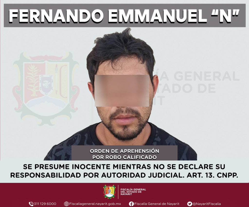 Elementos de la Agencia de Investigación Criminal de Nayarit ejecutaron una orden de aprehensión en la capital nayarita contra Fernando Emmanuel “N”, por su probable participación en hechos que para la ley configuran el delito de robo calificado, cometido en perjuicio de una persona de sexo masculino de identidad reservada para salvaguardar su privacidad e integridad.