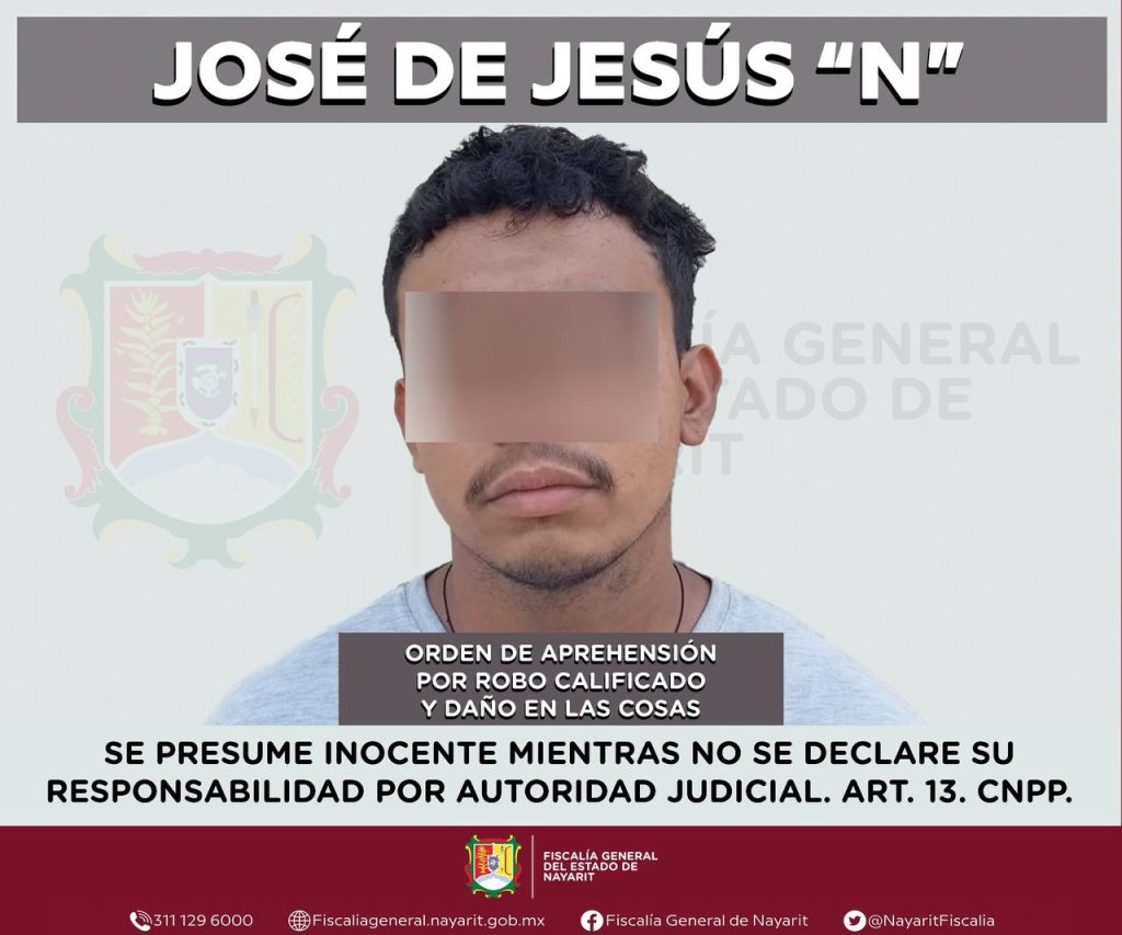 Elementos de la Agencia de Investigación Criminal de Nayarit ejecutaron una orden de aprehensión en la ciudad de Tepic contra José de Jesús “N”, por su presunta participación en hechos que la ley tipifica como delitos de robo calificado y daño en las cosas, cometidos en agravio de una persona de sexo masculino de quien se reserva la identidad con objeto de salvaguardar su privacidad e integridad.