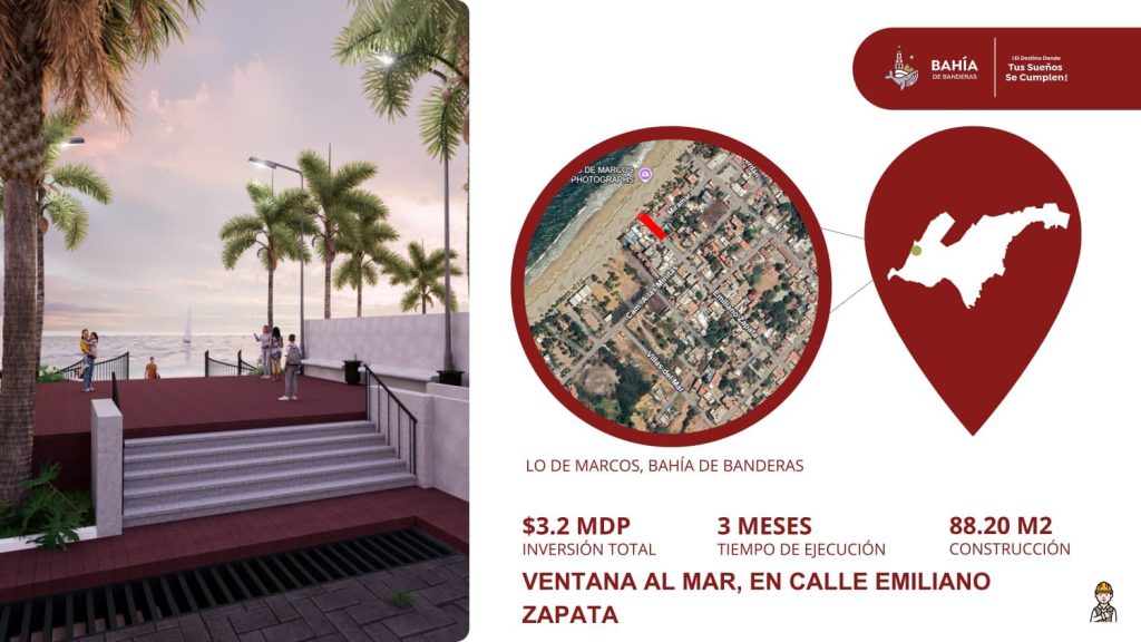 Con el objetivo de atender un problema de inundaciones que por años ha afectado a vecinos y visitantes, el Gobierno Municipal de Bahía de Banderas construirá una Ventana al Mar en la calle Emiliano Zapata, en la localidad de Lo de Marcos, una obra que además de mejorar la imagen urbana, incorporará infraestructura para el manejo adecuado del agua pluvial y del oleaje.