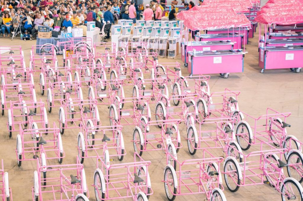 La dotación incluyó carritos para venta de hamburguesas, hot dogs y tacos, triciclos de carga, así como paquetes para cocina económica, lonchería, costura, corte de cabello y uñas, entre otros artículos para distintos giros productivos.