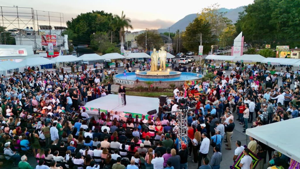 Geraldin Ponce Celebra a artesanas y artesanos en la explanada de la Ciudad de las Artes Indígenas de Nayarit.