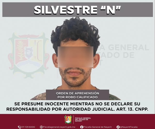 La Fiscalía General del Estado de Nayarit informa que a través de la Agencia de Investigación Criminal ejecutó una orden de aprehensión en el municipio de Bahía de Banderas contra Silvestre “N”, por su presunta participación en hechos que la ley tipifica como delito de robo calificado, en perjuicio de una persona de sexo masculino de quien se reserva la identidad para salvaguardar su privacidad e integridad.
