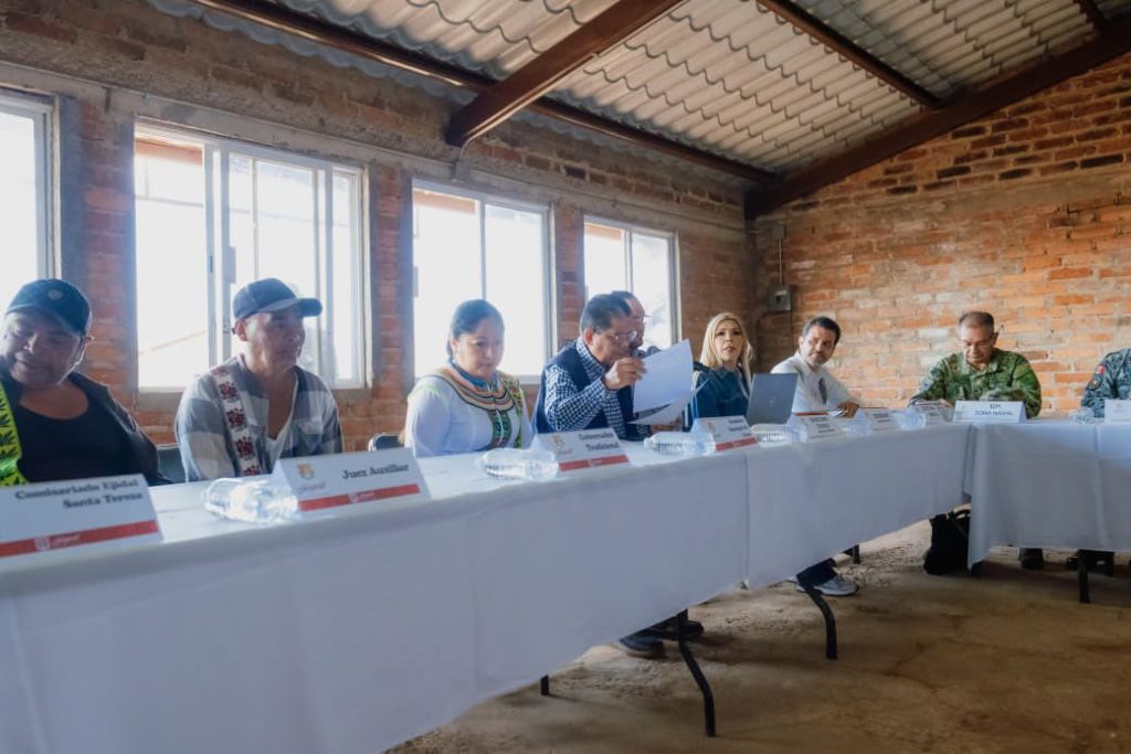 El gobernador del estado, Miguel Ángel Navarro Quintero, encabezó la sesión de la Mesa Estatal de Construcción de la Paz y la Seguridad en la comunidad de Santa Teresa, municipio de Del Nayar, con la presencia del General de División E.M. Porfirio Fuentes Vélez, comandante de la V Región Militar, y del General de División G.N. E.M. José Martín Luna de la Luz, de la Guardia Nacional, así como de autoridades de los tres órdenes de gobierno.
