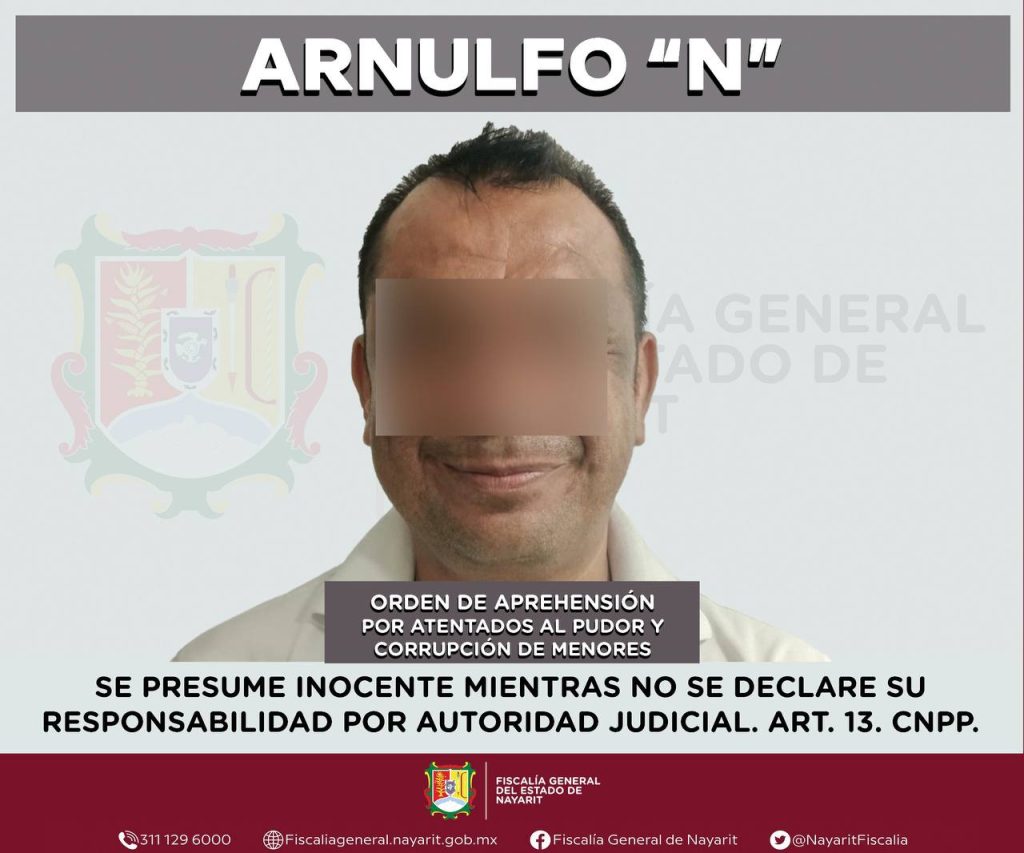 La Fiscalía General del Estado de Nayarit informa que elementos de la Agencia de Investigación Criminal ejecutaron una orden de aprehensión en el municipio de Bahía de Banderas en contra de Arnulfo “N”, por su presunta participación en hechos que la ley tipifica como los delitos de robo, atentados al pudor y corrupción de menores, cometidos en agravio de una menor de edad, cuya identidad se reserva para proteger su privacidad e integridad.